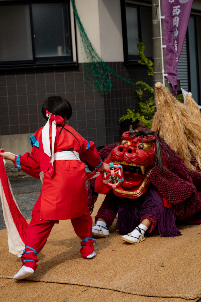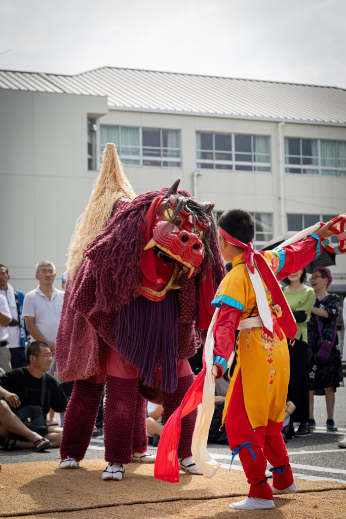銅鑼(ドラ)と鉦のリズムに合わせて雌雄二頭の獅子と童子が戯れる様子が表現されていると言われています。